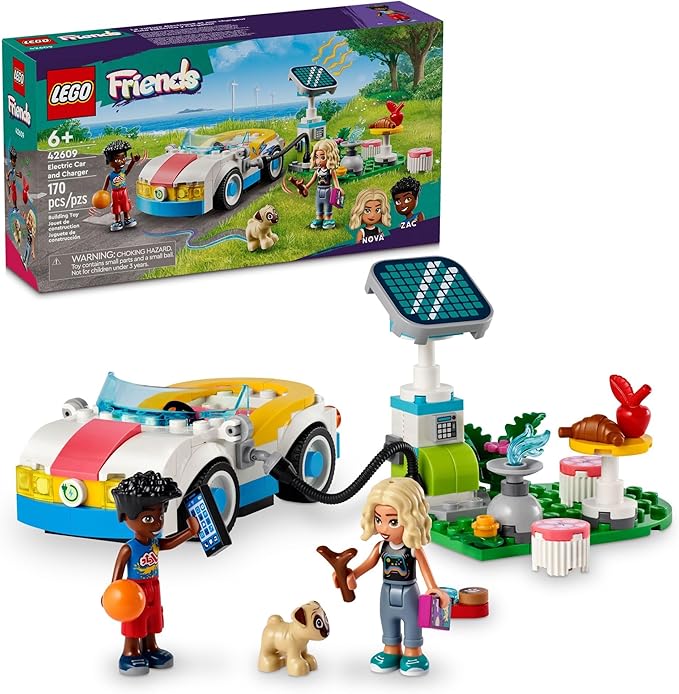 LEGO CARRO ELETRICO E CARREGADOR Conjunto LEGO Friends Carro Elétrico e Carregador para crianças maiores de 6 anosO carro inclui assentos e um capô que abre com espaço para guardar acessóriosInclui uma estação de recarga de veículos movida por energia solar construívelO conjunto inclui os personagens de LEGO Friends Zac e Nova, além de uma figura de cachorroOs acessórios incluem uma mesa, 2 cadeiras, uma bola, maçã, croissant e tigela para pet