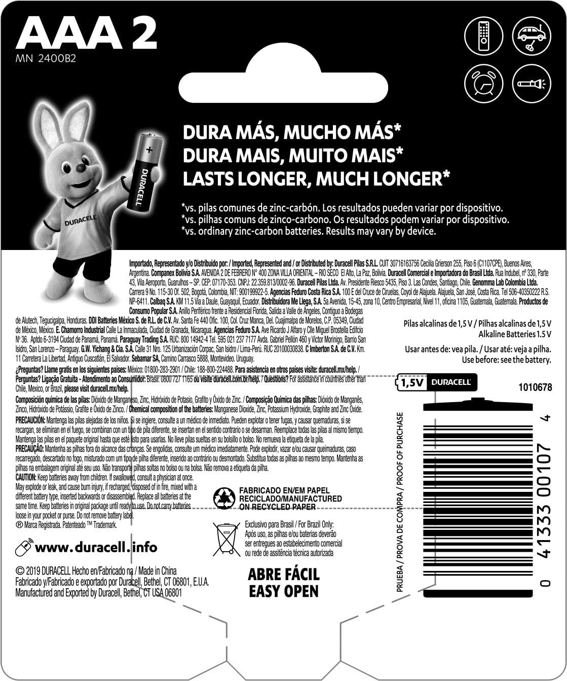 A pilha mais vendida no mundo inteiro foi desenvolvida para suprir suas necessidades diárias de energia.Fabricadas com tecnologia superior e ingredientes de alta qualidade, as pilhas Duracell duram até 8 vezes mais que as pilhas comuns de zincocarvão. São desenvolvidas para um rendimento duradouro e eficaz, seja em brinquedos, controles remotos, câmeras fotográficas, dispositivos de áudio e muito mais.A pilha alcalina mais vendida no mundo inteiro. A Pilha Alcalina é um produto desenvolvido pela Duracell, uma empresa líder em soluções de energia de longa duração.Dados TécnicosMarca: DuracellModelo: AAAQuantidade: 2 unidadesTipo de Pilha: AlcalinaOutras EspecificaçõesAS PILHAS ALCALINAS DURACELL DURAM MAIS, MUITO MAISVs. Pilhas comuns de zincocarvão