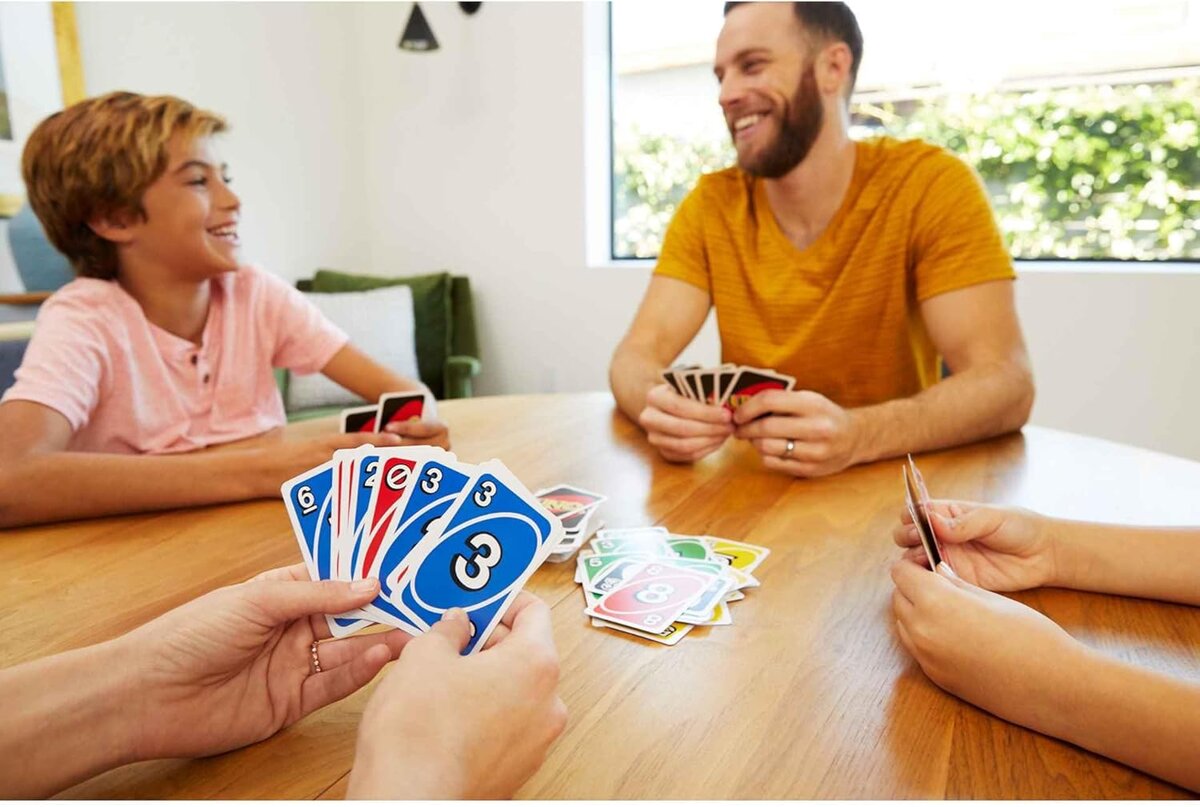 JOGO DE CARTAS UNO ORIGINAL CX.C/12 W2085 MATTELUNO, o clássico jogo de cartas de combinar cores e números que é fácil de pegar...impossível de largar, agora vem com curingas personalizáveis para maior emoção Os jogadores revezam na competição para se livrar de todas as cartas, combinando uma carta da mão com a carta atual mostrada no topo do baralho. Cartas de ação especiais proporcionam momentos que mudam o jogo e ajudam a derrotar os oponentes Use a carta Trocar as mãos para trocar cartas com qualquer outro oponente e use os 3 curingas personalizáveis (e apagáveis) para escrever suas próprias regras Você encontrará 19 cartas de cada cor (vermelho, verde, azul e amarelo), além de 8 cartas Comprar duas, Inverter e Pular em todas as cores, junto com 4 cartas Curingas, 4 cartas Comprar mais quatro, 1 carta Trocar as mãos e 3 cartas Personalizáveis. Se você não conseguir fazer uma combinação, você deve comprar da pilha central Não se esqueça de gritar "UNO" quando tiver apenas uma carta restante O jogador que se livrar de todas as cartas em sua mão marca pontos por quaisquer cartas que seus oponentes estiverem segurando. O primeiro jogador a atingir 500 pontos ganha. Get Wild 4 UNO incluI 112 cartas e instruções. Cores e detalhes podem variar.O clássico jogo de cartas de combinar cores e números.As cartas de ação especiais e curingas para emoções inesperadas e diversão que pode mudar o jogo.Use as cartas Trocar as mãos para trocar as mãos com qualquer outro oponente.Escreva suas próprias regras para jogar com os curingas personalizáveis.Os jogadores se revezam combinando uma carta em sua mão com a cor ou o número da carta mostrada no topo do baralho.Não se esqueça de gritar "UNO" quando tiver apenas uma carta restante